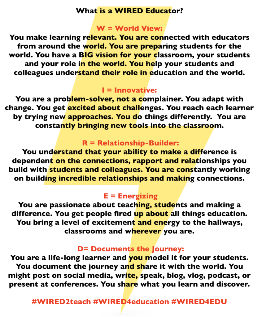 I had some fun this morning weaving my thoughts on education into what could be an acronym for what being a WIRED Educator means. I’d love to read your ideas.